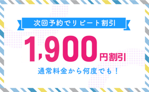 次回の予約を入れるだけで、何度でも通常料金から1,900円割引! 会計時に次回の予約を入れていただくと何度でも通常料金から1,900円割引になります。 リピート…