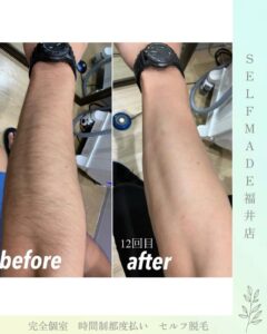 写真は、腕脱毛12回照射後のビフォーアフターになります。