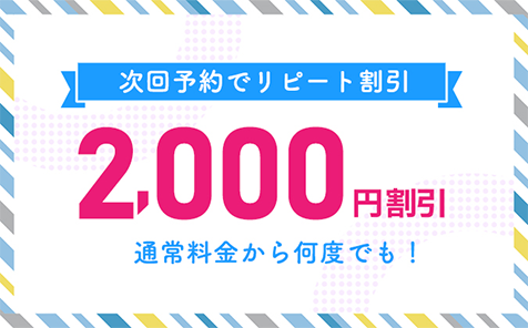 次回の予約を入れるだけで、何度でも通常料金から2,000円割引! 会計時に次回の予約を入れていただくと何度でも通常料金から2,000円割引になります。 リピート…