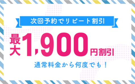 次回の予約を入れるだけで、何度でも通常料金から最大1,900円割引! 会計時に次回の予約を入れていただくと何度でも通常料金から最大1,900円割引になります。 …