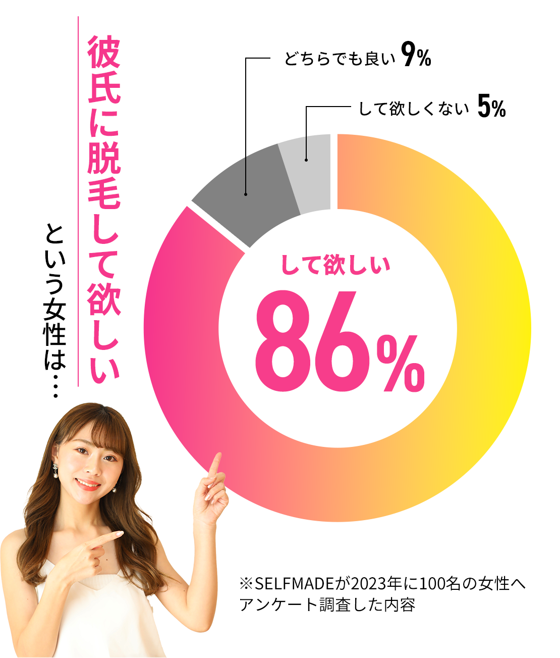 脱毛してほしくないと回答した女性はわずか5%と、彼氏に脱毛して欲しいと考えている女性のほうが圧倒的に多い時代です!