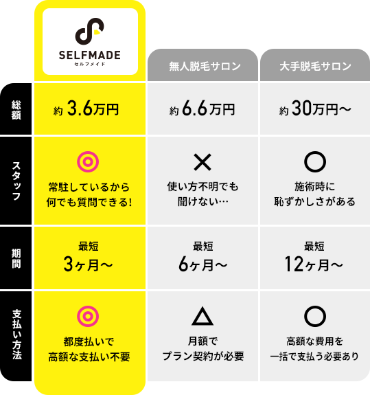 セルフメイドはコスパ最強の都度払いでまとまった費用が不要で始められるセルフ脱毛サロンです。
